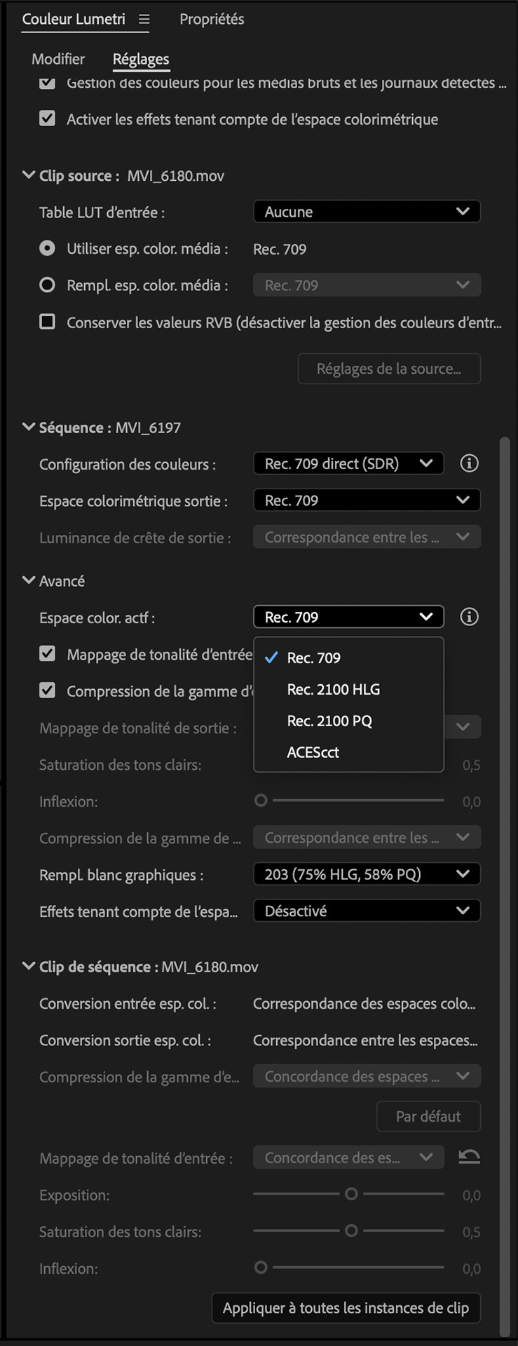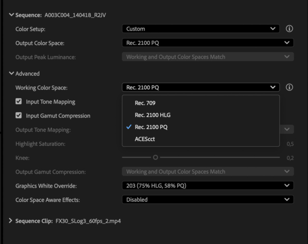 Les paramètres avancés de colorimétrie d’Adobe Premiere permettent de choisir un espace de travail large, et même d’opter pour l’ACES cct afin d’être compatibles avec des workflows haut de gamme.