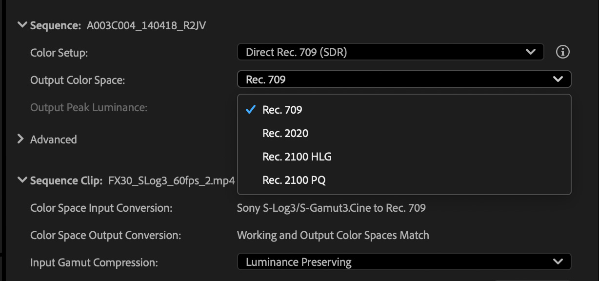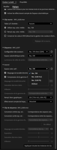 Les médias vidéo sources peuvent donc être automatiquement reconnus et développés vers le format de sortie choisi si les métadonnées sont inscrites sur les fichiers. Dans le cas contraire, l’utilisateur peut sélectionner le bon espace colorimétrique de ses médias sources si les profils correspondants ne sont pas encore intégrés dans Premiere Pro ou utiliser des LUT.