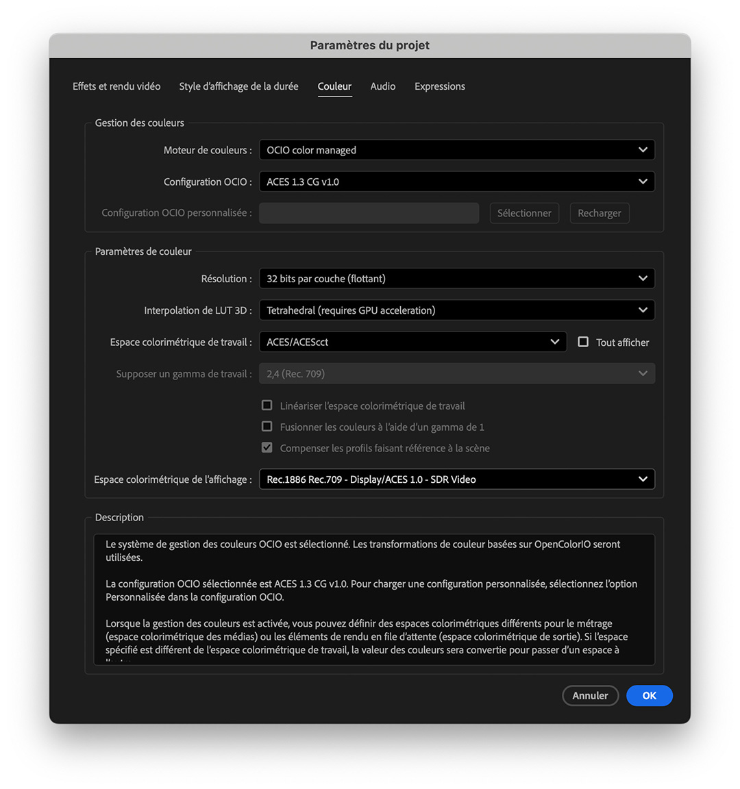 L’OCIO, acronyme de OpenColorIO, est une bibliothèque libre et open source qui ouvre After Effects à des workflows plus spécialisés. L’option Adobe Color Managed sera privilégiée dans les échanges entre Premiere Pro et After Effects.