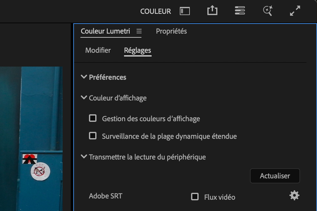 Les réglages dédiés sont disponibles dans les menus préférences et réglages projet d’Adobe Premiere Pro ; ils sont également centralisés dans un onglet de la fenêtre Couleur Lumetri du logiciel. La gestion de la colorimétrie des écrans nécessite une accélération GPU (carte ou puces graphiques dédiées). Les normes de diffusion SDR Rec. 709 ou HDR Rec. 2100 (PQ ou HLG) sont sélectionnables.