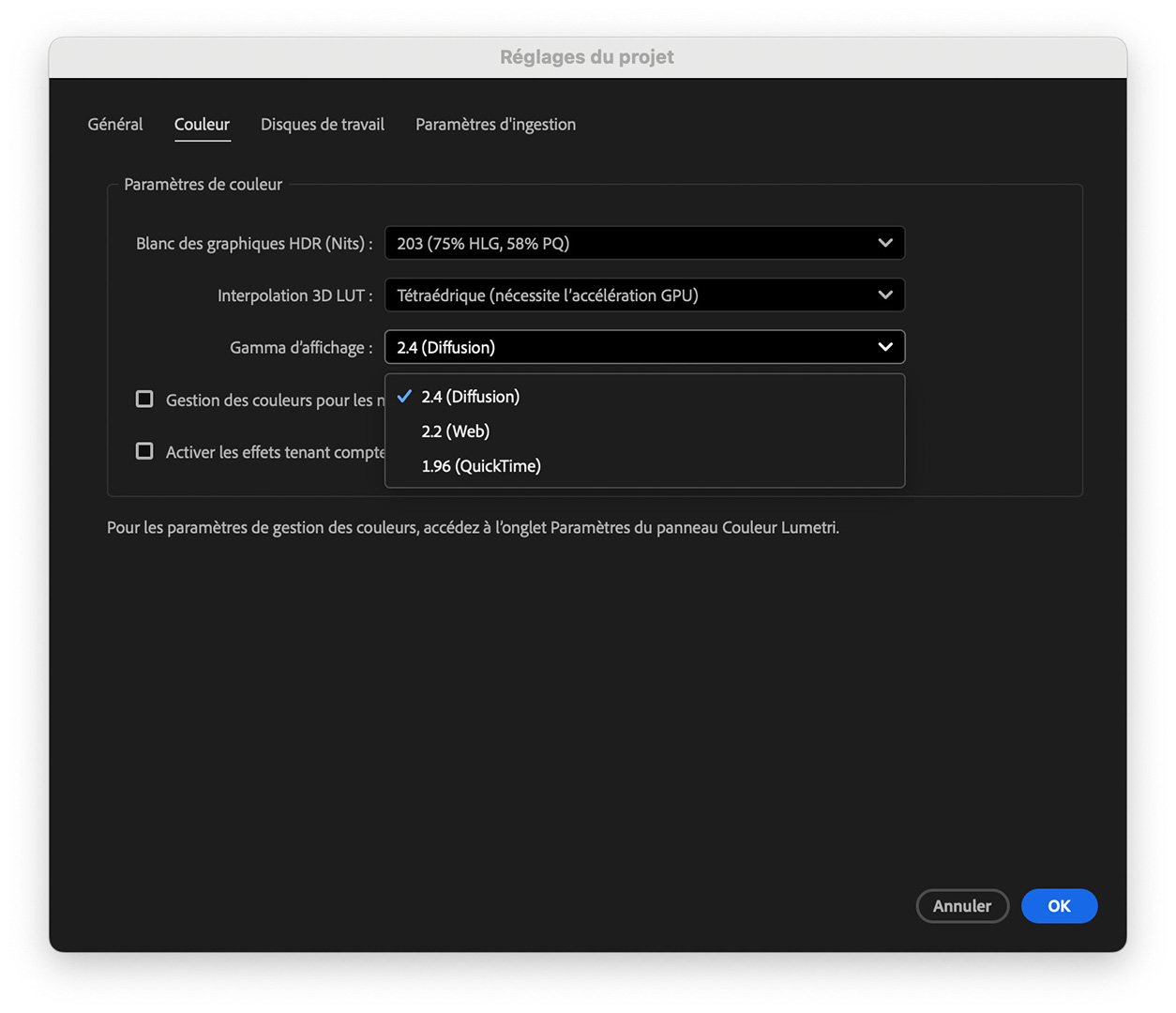 Les réglages du projet Adobe Premiere permettent de gérer plusieurs paramètres de colorimétrie tels que la luminosité maximale des infographies SDR importées dans un projet HDR, la reconnaissance et le développement automatique des images RAW et log (lorsque les métadonnées sont correctement renseignées), et le comportement des effets « prêts pour la gestion colorimétrique » (color space aware).