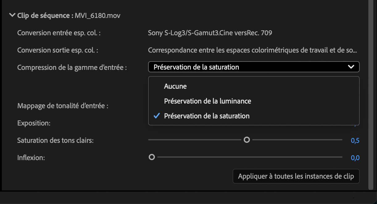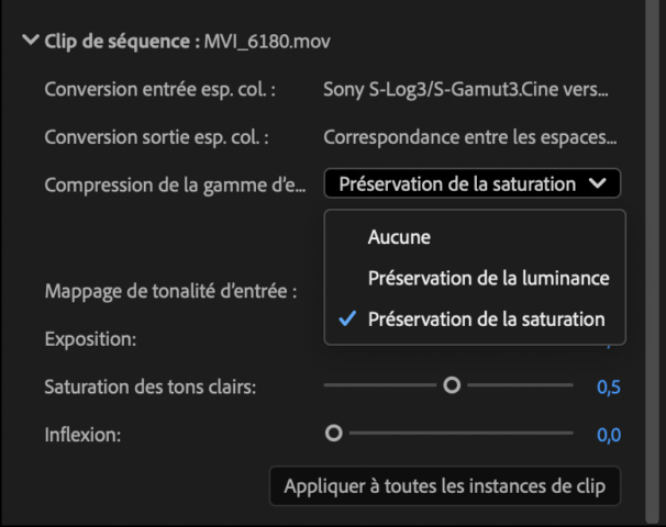 Lorsque le profil de diffusion est plus petit que les profils des sources, par exemple si des rushs de caméras Sony S-Log3/S-Gamut3.Cine et Sgamut3 sont traités pour une diffusion en Rec. 709, des options de tone mapping (mappage des tonalités) et de compression de gamut permettent de prioriser la préservation de la luminosité ou de la saturation et de la teinte.