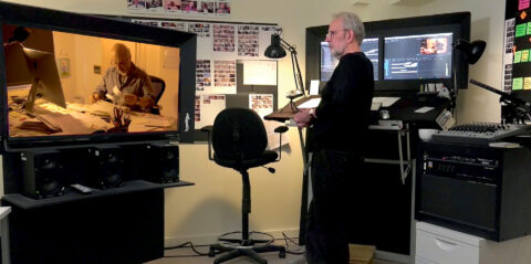 Walter Murch : À vrai dire, la salle de montage que l’on voit dans Coup 53, est pratiquement identique à toutes les salles de montage dans lesquelles j’ai travaillé sur les vingt-cinq dernières années : je travaille debout, avec un bureau d’architecte surélevé et deux moniteurs, et puis il y a un troisième moniteur, plus grand, à gauche du bureau. Par bonheur, il se trouve que c’est une installation qui se prête bien à être filmée ! C’est plus dynamique, puisque je ne suis pas simplement assis, mais en tout cas c’est ainsi que je travaillais avant même que nous prenions le parti de montrer au spectateur l’envers du décor.