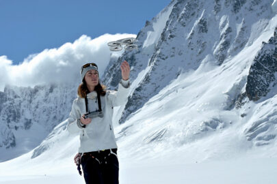Pour montrer l’avancée des athlètes dans le cadre majestueux de la haute-montagne, je voulais faire des prises de vue aériennes avec un drone. Celui-ci devait être aussi compact et léger que possible, tout en étant capable de voler à haute altitude (jusqu’à 4 000 mètres). Sur la neige et sur des pentes raides il n’est pas envisageable de décoller ni d’atterrir au sol, donc il faut pouvoir le faire s’envoler depuis sa main.