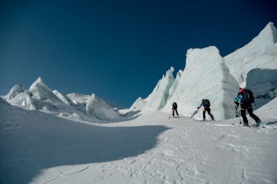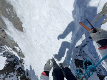 Maria, un guide autrichien, est venue assurer ma sécurité pour que je puisse être sur une cordée autonome pour pouvoir filmer à distance. J’étais stressée par cette journée, car je n’avais encore jamais skié avec elles et je craignais de ne pas arriver à tenir leur rythme. Je m’étais entraînée tout l’hiver, mais malgré tout je ne suis pas championne de ski-alpinisme. Heureusement pour moi, le poids de leurs sacs et l’enchaînement des jours de longs efforts les faisait avancer à une vitesse proche de la mienne. La difficulté, c’est qu’elles ne s’arrêtaient presque jamais.