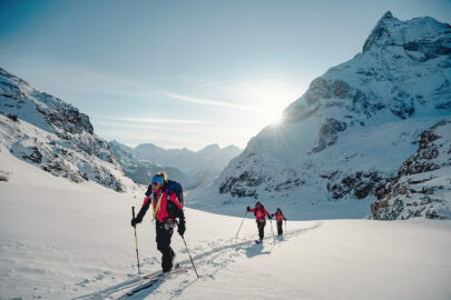 Après cette première ascension, elles ont continué à travers l’Autriche et ont vécu des moments difficiles en raison d’un virus (une bronchiolite), de blessures, tempêtes, avalanches… Je les ai rejointes dix jours plus tard, et les ai trouvées éprouvées par le début de leur traversée. Nous sommes montées jusqu’au refuge sous la neige. Le lendemain il a fallu faire la trace dans la profonde, mais nous avons été récompensées par une descente grandiose dans une poudreuse de rêve et dans le cadre sauvage du Tyrol où l’on ne croise personne. Rien de tel pour retrouver la motivation d’avancer.