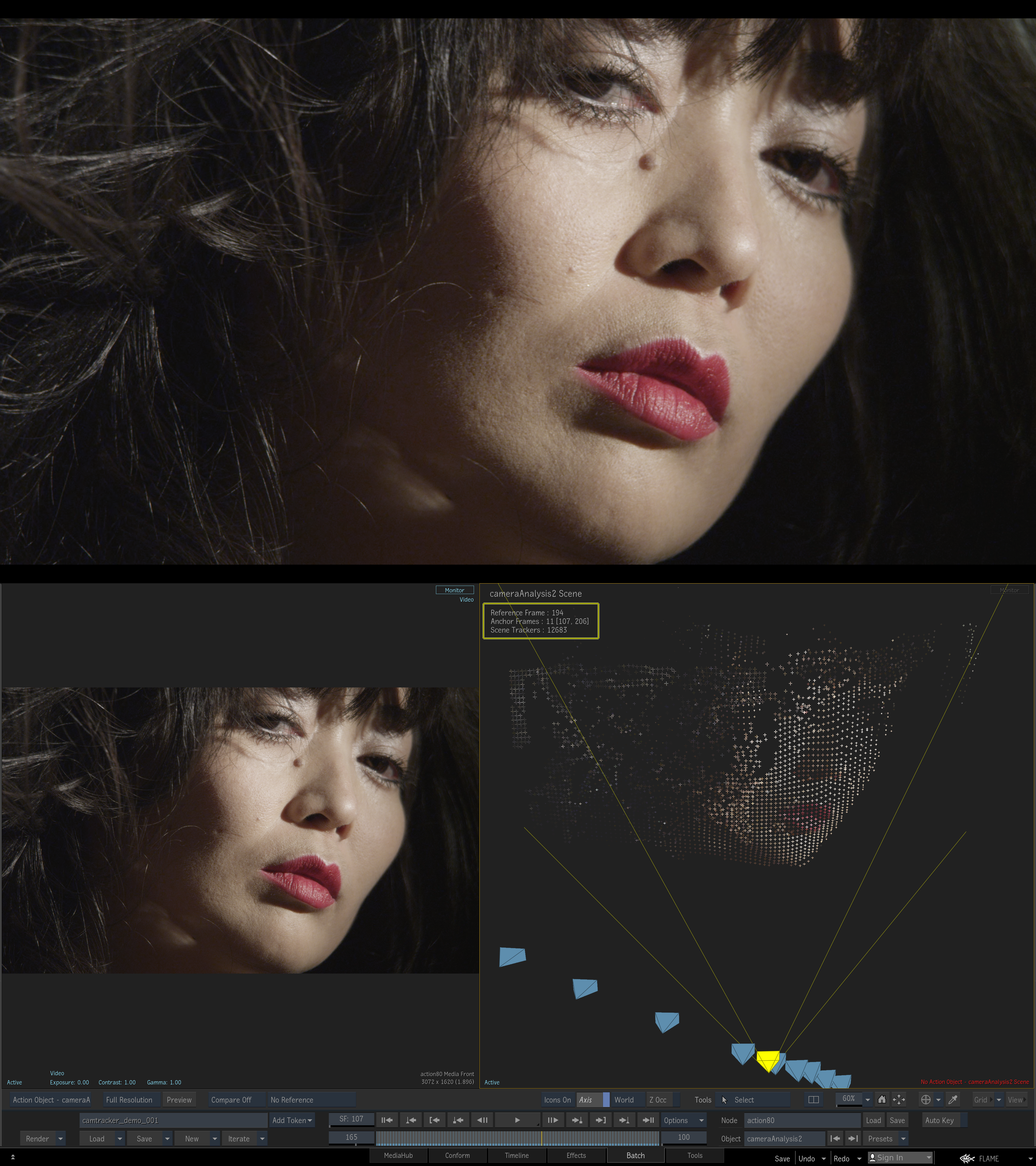 Suivi de caméra Nex-gen : En utilisant des algorithmes de reconstruction de scène similaires à la ” vision ” intelligente des véhicules autonomes et à la capture de nuages de points, le nouveau suivi de caméra de Flame « masque automatiquement » ou ignore les objets en mouvements comme les personnes, les voitures, les surfaces d’eau , et le ciel, et se concentre uniquement sur l’environnement de la scène statique, de sorte que les artistes n’aient plus à passer du temps à masquer manuellement les objets en mouvement pour obtenir un résultat performant. Dans de nombreux cas, le nouveau tracker de caméra offre aux artistes une solution en un clic, offrant des résultats de haute qualité avec l’analyse de plus de 5 000 points en une fraction du temps nécessaire avec les flux de travail traditionnels.