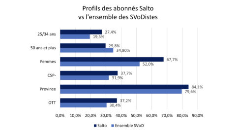 De plus, l’audience de Salto est plus jeune et plus féminine que la moyenne des autres plateformes SVod. Le recrutement de la plateforme s’est aussi davantage effectué parmi les CSP-, et hors de la région parisienne : un signe distinctif plutôt séduisant…