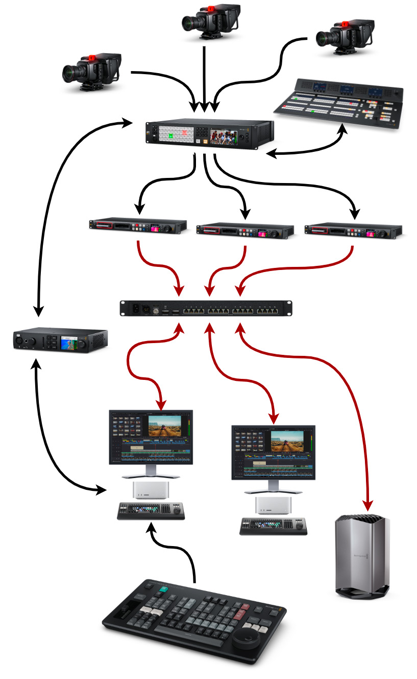 Dans les solutions les plus complètes, les caméras sont connectées à des mélangeurs Atem tels que les Constellation 4K ou 8K qui assurent une synchronisation des timecodes de l’ensemble des sources. Chacun des flux est orienté vers des enregistreurs HyperDeck qui écrivent leurs données sur un des modèles de la famille de stockages Cloud Store : Cloud Pod, Cloud Dock 2 ou 4, Cloud Store Mini ou Cloud Store Max.