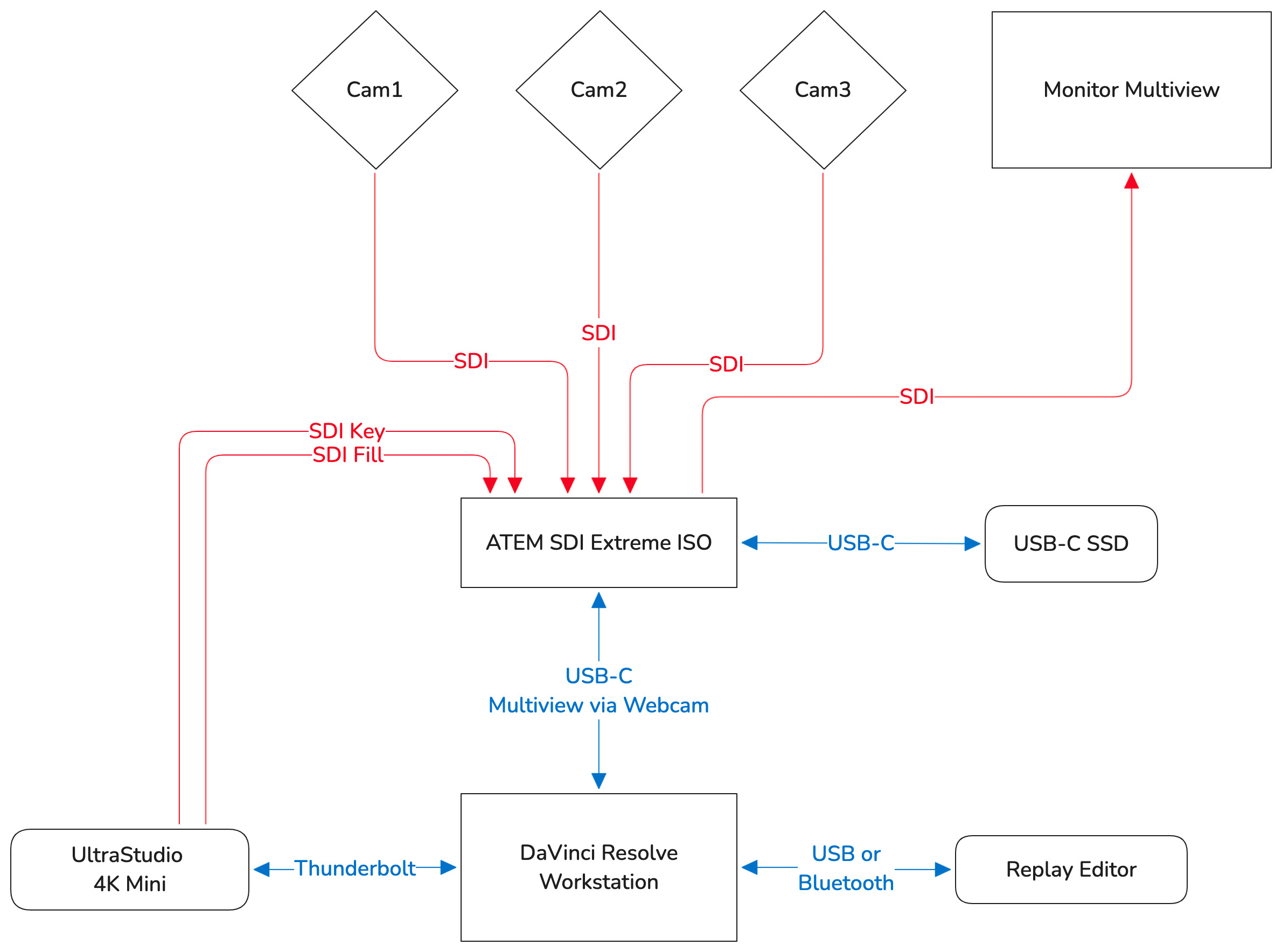 Une version plus abordable et simple d’exploitation du Replay peut être conçue autour d’un des modèles de mélangeur Atem Mini Extreme ISO G2 Atem SDI Extreme ISO. Les caméras sont connectées en HDMI ou SDI et la station de travail est branchée au mélangeur en USB (USB-A/USB-C), un disque de stockage SSD étant relié en USB-C à l’Atem. La résolution est limitée à la haute définition et le codec H.264 des flux ISO enregistré sur le SSD applique une compression inter-images.