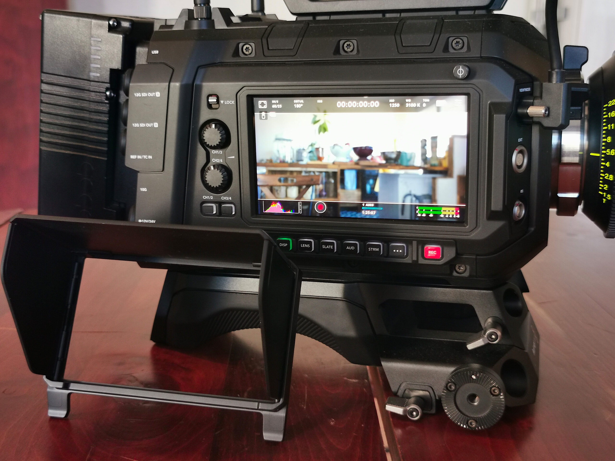 Dès la sortie de son carton, nous avons été surpris par le poids de l’Ursa Cine 12K. Ses 3,96 kg augmentés des objectifs, des accessoires et de la batterie devront être compensés par un support adapté pour aborder sereinement de longues sessions de tournage : épaulière ou easyrig par exemple. En configuration cinéma, ce poids pourra être un avantage pour absorber les micro- vibrations des tournages « main libre ».