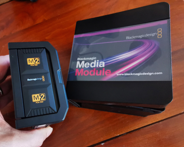 Les Blackmagic Media Module de 8 ou 16TB développés pour cet usage exploitent des SSD M2 PCIe (1 475 ou 2 325 euros). Un module optionnel permet d’utiliser deux cartes CF express de type B. Après le tournage les médias peuvent être rapidement transférés ou directement exploités via le Blackmagic Media Dock (1 725 euros) et ses trois emplacements Media Module en façade.