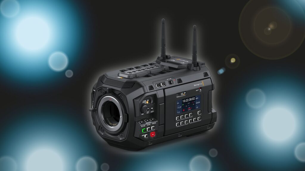 La Blackmagic URSA Cine dispose d’un grand écran tactile HDR dépliable de 5″ d’un côté et d’un écran LCD couleur externe de l’autre.