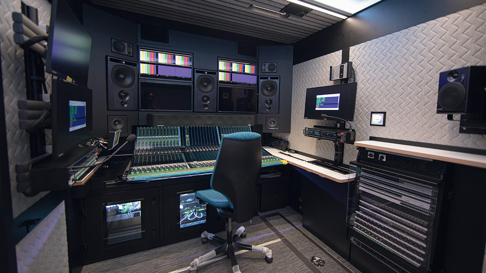 L’installation audio est, elle aussi, à la pointe du progrès, les véhicules étant parmi les premiers d’Europe à pouvoir produire en Dolby Atmos. Le traitement des signaux audio est assuré par une console Stagetec Avartus. Autre point exceptionnel, la conception acoustique de l’intérieur, prévue pour le mixage Dolby Atmos et caractérisée par un excellent niveau de suppression du bruit et d’isolation acoustique. L’acoustique technique et sonore ne laisse rien à désirer, et l’intérieur n’utilise pas de surfaces réfléchissantes. Au cours du projet, SRG a également consulté un acousticien externe.