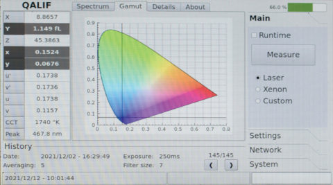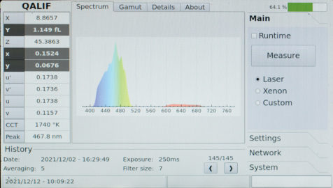 C’est le type de capteur. Les bandes d’analyses des spectromètres sont beaucoup plus précises. C’était moins impactant sur les projecteurs à lampes xénon UHP, mais beaucoup plus sur les projecteurs lasers dont les raies extrêmement fines imposent des bandes d’analyse d’une même finesse. Les bandes d’analyse de deux nanomètres des Qalif Spectro et Ultimate autorisent des mesures extrêmement précises. Au lieu de mesurer le pic d’une raie d’un laser, la largeur des bandes d’analyses des outils de mesures exploitées à l’époque des lampes xénon, intègre la mesure sur une grande surface et peut provoquer des erreurs importantes. Un vrai spectromètre évite cet écueil en étant capable de proposer des mesures aussi fines que les raies des lasers. C’est plus important sur les lasers RGB que sur les lasers types « phosphores » qui élargissent le spectre. Mais même pour les projecteurs à lasers phosphores, on utilise des lasers directs pour le rouge ou le bleu.