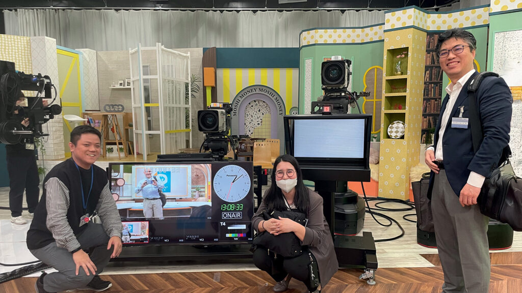 Les décors des émissions dans le plus grand studio de TV Osaka. De gauche à droite : Kawamura Shinya de TV Osaka, Nakagawa Maki et Shimizu Yasuhiko de Panasonic. Tout à gauche, la caméra sur la grue. © François Abbe