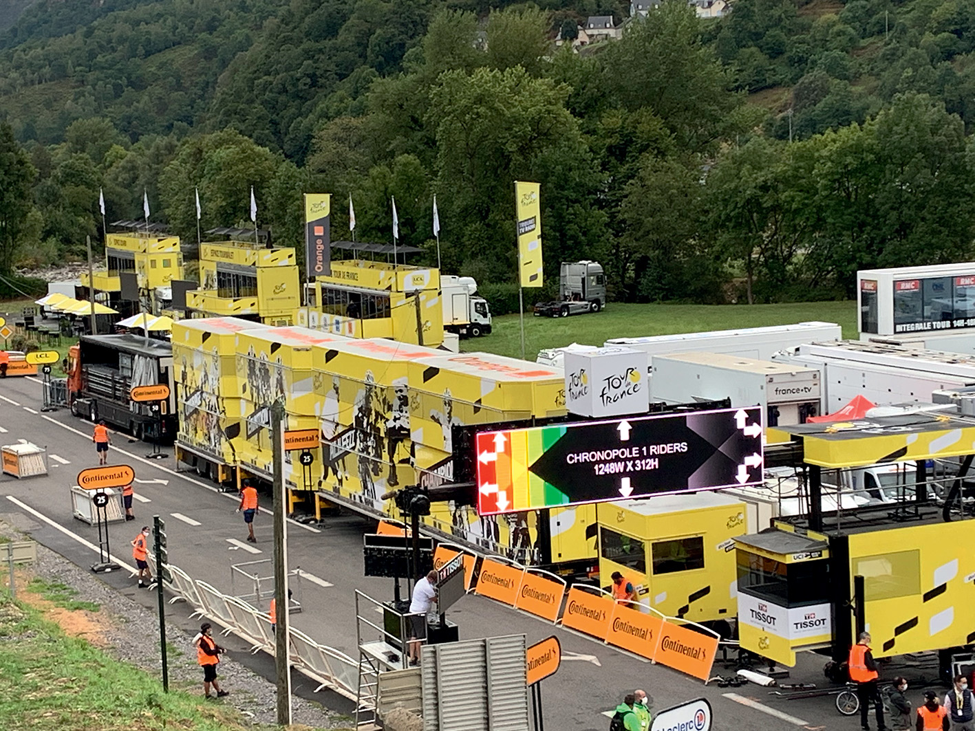 Ici, la desserte interne s’adapte à la topologie des lieux. À Nice, par exemple, d’où s’est élancé le Tour 2020, le studio RMC, sur la promenade des Anglais, était situé à 400 mètres à une extrémité du camion d’Orange et le car de production de l’ARD (télévision allemande) à 300 mètres à l’autre extrémité, soit une zone d’arrivée de 700 mètres de long. Par comparaison, celle de Privas était plus compacte.