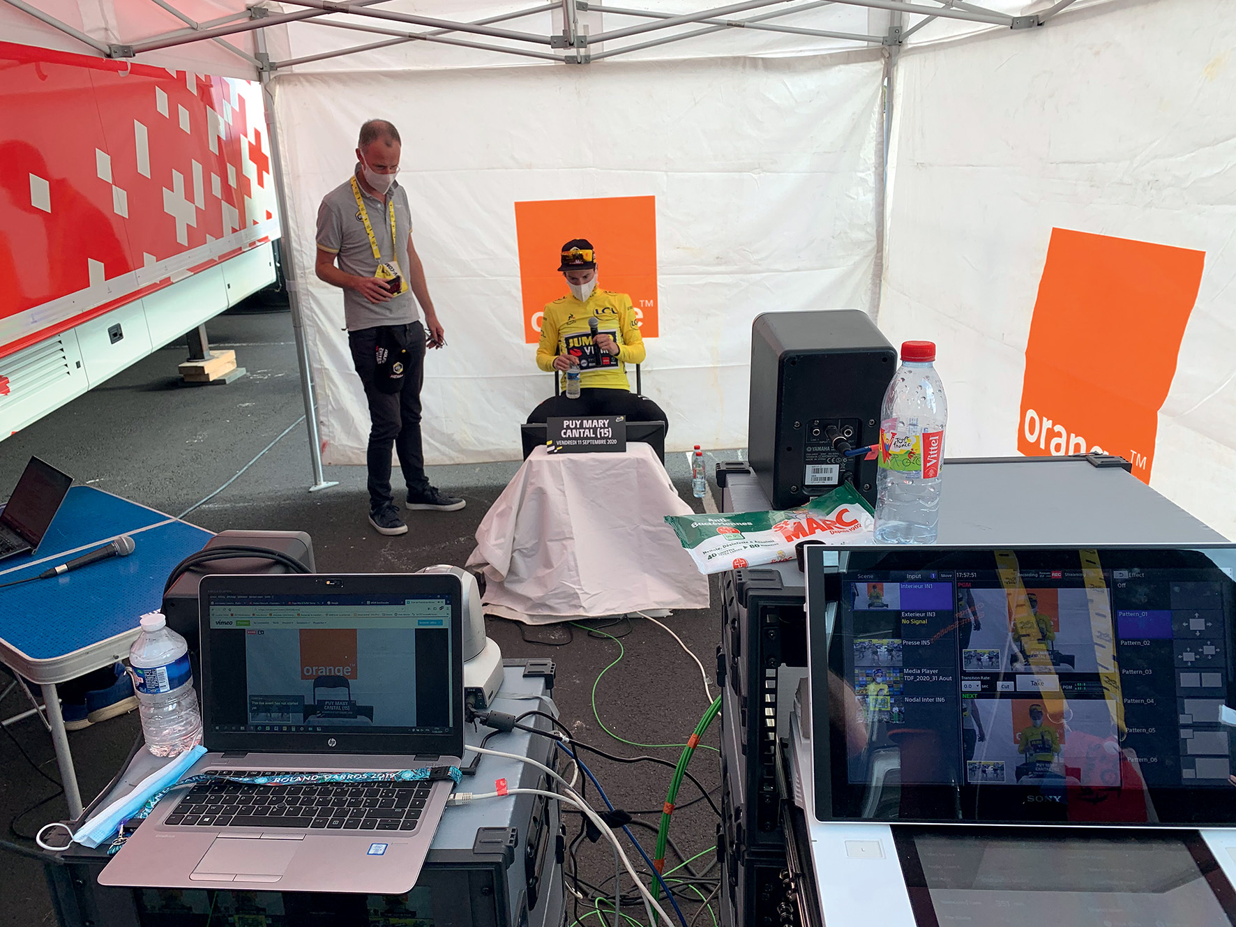 De même, en raison de la crise sanitaire, Orange a dû mettre en place une solution sur mesure pour les conférences d’après-course. Dans la salle de visioconférence, située dans le quartier des coureurs, seuls un technicien d’Orange et le traducteur étaient présents. Tout se faisait par écran interposé. Le système de visioconférence HD reposait sur un lien SDSL 50 Mb/s et des encodeurs/décodeurs MGW Ace de la marque Vitec ont été testés pour l’occasion. « Les performances de ces équipements en matière de latence, avec des délais ultra faibles (jusqu’à 160 ms), alliées à des qualités d’encodage et la possibilité d’utiliser plusieurs profils préconfigurés, ont motivé ce test. Pour les journalistes externes à la course (ligne d’arrivée, salle de presse), une interface WebEx sur notre régie permettait des interventions distantes. »