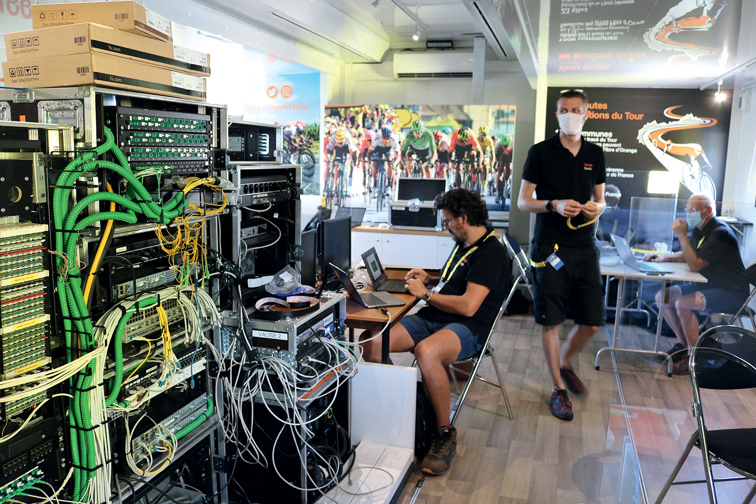 Sur la Grande Boucle, trois dessertes internes incombent à l’opérateur national. D’abord, le village départ et ses trois réseaux wi-fi, son réseau de caméras de vidéosurveillance, ses liaisons pour le podium signature et pour les médias, son réseau GSM. Ensuite, la salle de presse avec ses cinq réseaux, ses lignes pour l’organisation (jury des commissaires, produits dérivés, hébergement, caravane publicitaire, direction des sites, garde républicaine…), ses véhicules itinérants (camion reprographie/accréditations, camion médical pouvant réaliser des radiographies, échographies, soins de première urgence…). Enfin, la ligne d’arrivée avec 350 lignes fibre et cuivre, cinq réseaux wi-fi, un réseau de quatre caméras de vidéosurveillance, des liaisons prioritaires vers le PC Sécurité, le chronopôle, le pôle web et les réseaux sociaux d’ASO – l’organisateur du Tour –, le bus interview, la tribune commentateurs, le véhicule SNG de l’UER/Eurovision…