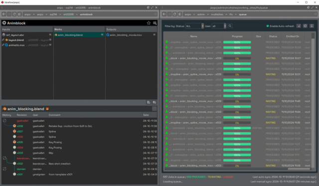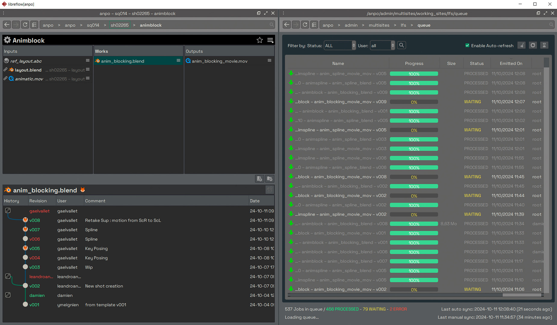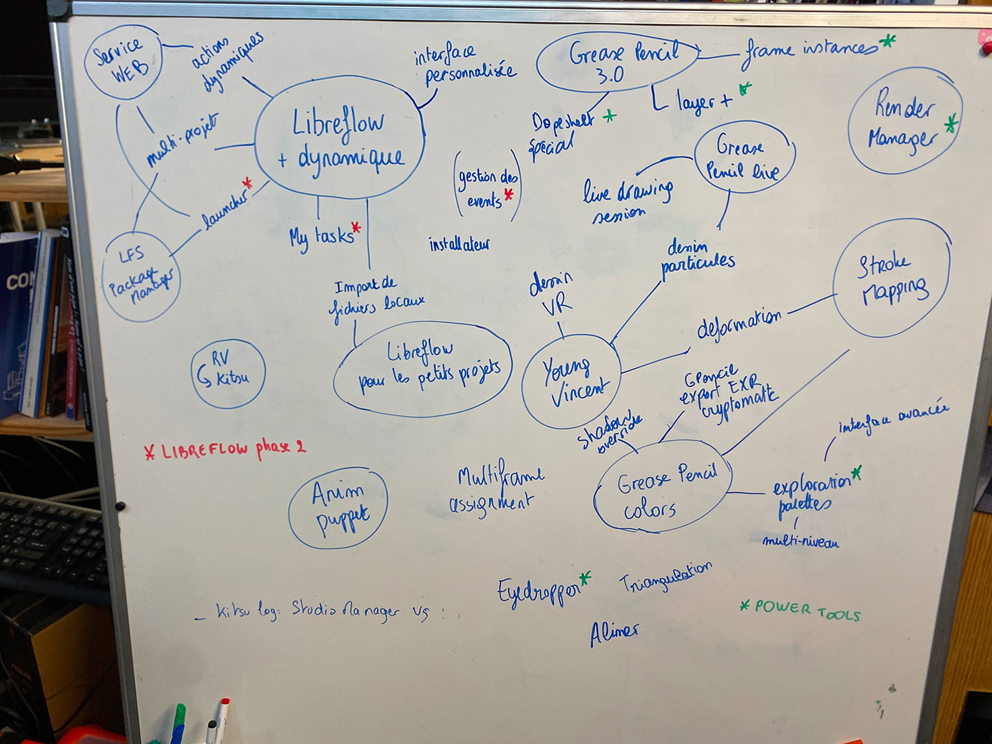 Un Asset Manager maison, LibreFlow, se base sur le framework Kabaret. Il permet de manipuler les fichiers et de flécher les actions nécessaires. LibreFlow gère l’historique de chaque modification et la nomenclature est capable de lancer les éditeurs (Blender, Maya…), et permet de suivre le worflow. Et esprit « libre » oblige, il est bien sûr disponible gratuitement sur le Gitlab des Fées.