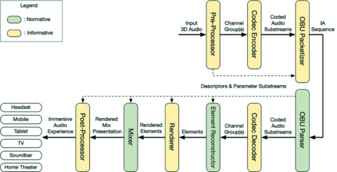 L’IAMF représente la première spécification de container gratuit à être proposée dans le cadre de l’AOMedia. Il a été conçu pour permettre aux créateurs de proposer leurs contenus audio immersifs dans le cadre de multiples applications : streaming, jeux vidéo, réalité augmentée et VR, sans oublier le broadcast. L’IAMF permet de véhiculer au travers d’un flux principal plusieurs éléments audio de nature différente. Plus précisément, on peut y trouver à la fois des contenus de type « channel based » (stéréo, 5.1, 7.1, etc.) mais aussi « scene-based » (Ambisonics, HOA), diffusables vers une grande variété de terminaux incluant les smartphones et la télévision. L’écoute peut se faire au casque, sur des barres de son ou en home theater.