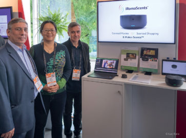 Iromascents est une des curiosités de cet IBC 2022. Imaginez que sur votre logiciel de montage, vous ne manipulez plus seulement des éléments audio et vidéo, mais aussi des éléments olfactifs (des « scents »), que vous glissez sur votre timeline. Vous générez ainsi un « scent file » qui va être interprété par un petit boîtier placé face à vous et qui diffusera la juste odeur au bon moment lorsque vous regardez votre film. C’est le produit développé par cette jeune société israélienne créée en 2020. Le diffuseur de senteurs peut être chargé avec un tambour de 45 odeurs interchangeable en fonction du genre du film : romance, cartoon, sport, horreur (on n’ose imaginer…), aventure, etc. Ce système est aussi décliné dans une version destinée aux boutiques de parfum et associé à une interface graphique qui vous guidera dans le choix de votre parfum.