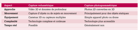 La capture volumétrique et la capture photogrammétrique sont deux techniques utilisées pour créer des représentations 3D à partir d’objets ou de scènes réels, mais elles diffèrent par leurs approches et leurs applications.