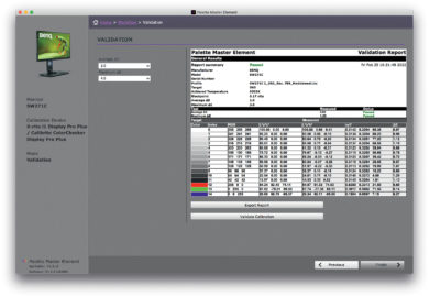 L’utilisateur peut ensuite comparer le résultat de l’écran avant/après la calibration. Après la calibration, il est conseillé de faire une mesure de vérification. Comme avec le logiciel Palette Master Element, ces mesures confirment également la qualité des écrans avec notamment l’information des données de delta E selon les différents patchs testés.