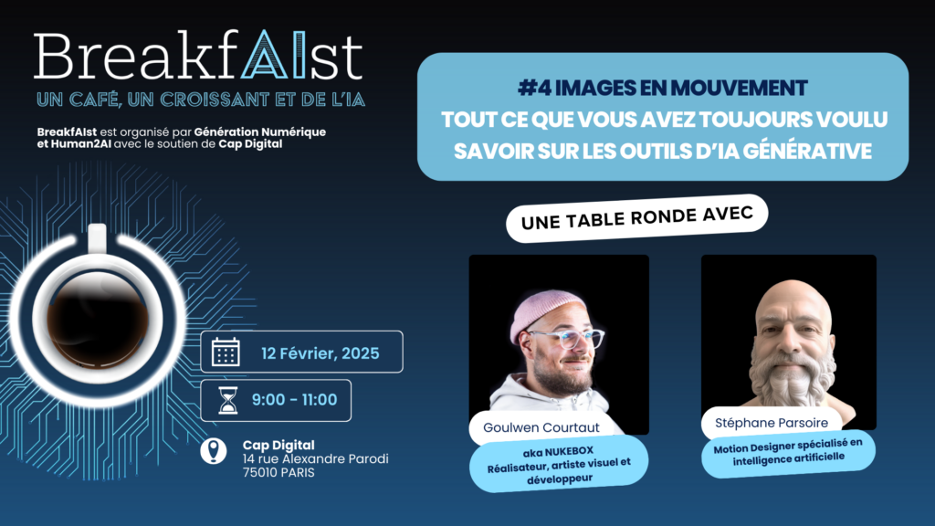 Un rendez-vous organisé par Génération Numérique et HUMAN2AI H2AI, avec le soutien de Cap Digital, autour de différents sujets en phase avec les problématiques des professionnels des secteurs de l’audiovisuel pour décrypter les enjeux de l’IA dans un cadre convivial autour d’un petit déjeuner.