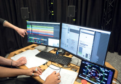 Le workflow est relativement simple. Les élèves importent des éléments sonores multipistes dans un PC équipé du logiciel Reaper, un DAW (Digital Audio Workstation) qui a la particularité de pouvoir traiter les pistes multicanales avec jusqu’à soixante-quatre canaux par piste, ce qui correspond à l’ordre 7 en ambisonique. L’audio est ensuite véhiculé en Dante (format de réseau audionumérique) jusqu’à un processeur Xilica qui va convertir le signal en trente-deux signaux analogiques pour les envoyer vers les amplis puis vers les enceintes. Ce DSP Xilica va aussi permettre de traiter séparément chaque canal audio avec de l’égalisation ou des délais pour du processing d’écoute, et de mémoriser des configurations. Il est piloté par une simple tablette qui permet d’agir sur les niveaux de chaque enceinte séparément ou modifier les traitements sur chaque canal depuis le poste de travail.
