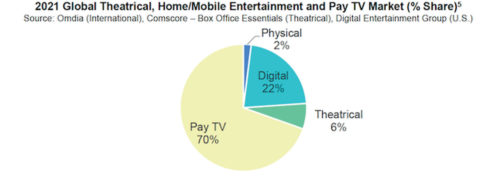 Grâce à la résistance du marché de la télévision payante au niveau mondial, mais aussi grâce à la solidité de la SVOD, le marché global est reparti à la hausse en 2021, posant les bases d’un marché du divertissement de plus en plus digital. Les abonnements à la télévision payante ont représenté 70 % du marché global composé des marchés du cinéma, du divertissement à domicile et de la télévision payante ; le marché numérique (22 %), le marché des salles de cinéma (6 %) et le marché physique (2 %) constituant le solde. Avec un chiffre d’affaires de 228,5 milliards de dollars, la télévision payante reste, et de loin, le premier centre de recettes de l’industrie audiovisuelle. Après avoir atteint 236 milliards en 2018, les abonnements à la télévision payante essuient cependant un repli d’année en année, en particulier aux États-Unis, où ils ont rapporté 13 milliards de dollars de moins en cinq ans.