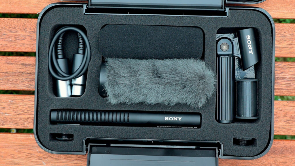Le microphone Sony ECM 788 est livré dans un gros coffret comprenant quelques accessoires : bonnette mousse pour l’intérieur, bonnette à poils courts pour l’extérieur, câble XLR et extenseur de diamètre pour le montage caméra. © Benoît Stefani