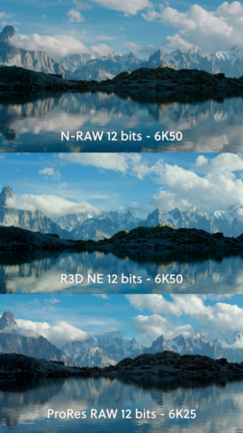 - R3D NE (pour Nikon Edition, en 12 bits contre 16 bits pour le R3D Red) jusqu’à 6K60 ;