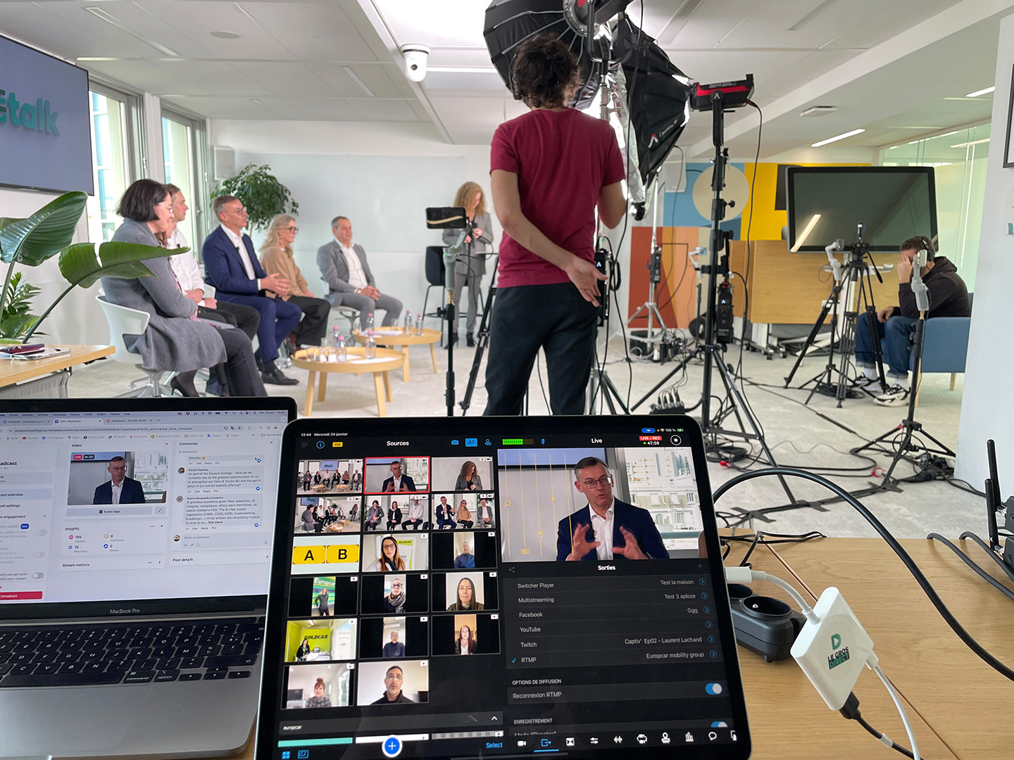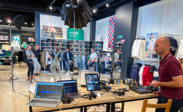 Cela dépend vraiment du projet. Le plus gros que nous faisons actuellement est celui de Karcher. Nous utilisons le stand créé pour leurs salons et installé pour ce live dans leurs locaux. Nous sommes sept avec une scripte, un réalisateur, deux cadreurs, un ingénieur et un assistant son et moi en chef de projet. Il y a aussi l’agence qui accompagne tout le côté éditorial. Sur les plus petits live comme des conseils municipaux, il n’y a qu’une personne : un réalisateur. Mais dans la majorité des prestations que nous proposons, sur les projets live shopping et les conférences, nous sommes trois : un réalisateur, un cadreur et un ingénieur du son.