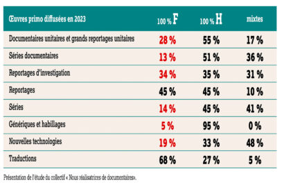 Lors du Fipadoc 2025, le collectif a présenté un premier état des lieux basé sur l’étude sur l’égalité femme-homme de la Scam publiée en mars 2023. Cette étude a mis en évidence de profondes inégalités dans la diffusion des œuvres audiovisuelles : si la traduction audiovisuelle est majoritairement féminine (68 %), la parité est seulement atteinte dans les reportages d’investigation (34 % d’œuvres féminines contre 35 % masculines). En revanche, les documentaires unitaires (26 % contre 57 %), les séries documentaires (13 % contre 48 %), les reportages (28 % contre 55 %) et les séries (13 % contre 51 %) restent très déséquilibrés. Ces chiffres témoignent de progrès extrêmement minimes depuis l’étude précédente de 2021.