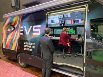 Dans le dock Pullman, la société belge exposait un car-régie regroupant en son sein l’ensemble des savoir-faire de production live développés et commercialisés par EVS. Le car full IP intégrait les nouveaux LSM compatibles avec ce type de connexion, le serveur XPedia et une remote remise au goût du jour, reliée pour l’occasion à des écrans tactiles. Le mélangeur Dyvi, architecturé autour d’une technologie software, trônait au niveau du poste de réalisation et pour cause, il s’agit d’un outil principalement destiné aux cars de tailles moyennes avant tout exploités pour les directs sportifs. C’est bien dans ce secteur que ce situe le cœur du marché d’EVS.