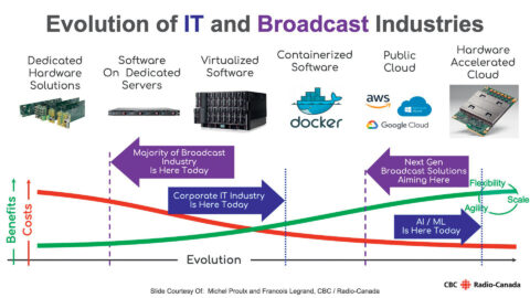 Radio-Canada en énumère les avantages : la migration vers le full IP réduit le nombre de câbles, permet l’utilisation de multiples formats vidéo (UHD ou HD, HDR ou SDR…), le partage d’équipements entre les studios et favorise l’innovation. Radio-Canada souligne toutefois un dernier avantage clé : l’utilisation agile de produits logiciels. François Legrand, de Radio-Canada, explique alors que les plates-formes se divisent en deux catégories :
