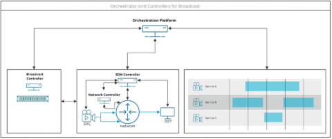 Selon Skyline Communications, qui propose la solution Dataminer, le Broadcast Controller se limite aux systèmes audiovisuels traditionnels. Dans le schéma, il existe un lien entre le Broadcast Controller et le contrôleur de réseau (SDN Controller), qui gère les nouvelles infrastructures ST-2110. L’ensemble du système est géré et surveillé par un orchestrateur.