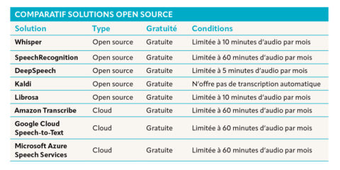 En parallèle, des solutions propriétaires telles qu’Amazon Transcribe, Google Cloud Speech-to-Text, et Microsoft Azure Speech Services dominent le marché. Ces services cloud offrent une prise en charge étendue des langues et des fonctionnalités avancées, mais nécessitent un investissement financier.