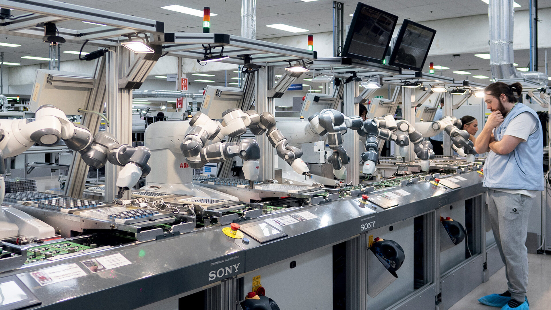 Les composants trop gros pour être placés en rouleaux et déposés par les machines Fuji étaient habituellement déposés à la main par une personne dont c’était l’unique tâche. Ce travail est désormais automatisé. La robotisation de certaines opérations est une des principales innovations. Par exemple, pour placer les boutons sur les RCP, ou encore les gros composants des Rasberry Pi, Sony a investi dans des robots à deux bras de la société suisso-suédoise ABB Robotics (modèle Dual-arm YuMi IRB). Ces petits robots sont épaulés par des caméras placées au-dessus d’eux. Des bacs contenant les boutons en vrac vibrent afin de faire tourner les pièces autant de fois que nécessaire pour être identifiables par les caméras, puis sont saisis et placés avec précision. Les deux bras de taille humaine et aux formes courbes sont implantés dans un buste qui donne un aspect humanoïde troublant. Par ailleurs ces bras sont inoffensifs car prévus pour des charges de 500 g max, donc pas de protection particulière pour les opérateurs.