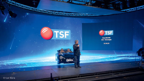 Créé par TSF et PRG, le Virtual Production Studio xR se compose d’un plateau de 800 m2 équipé d’un écran Led Black Onyx 2 de chez ROE de 23 m de long sur 5 m de haut, disposé en demi-cercle de 15 m de diamètre. Son pitch de 2,8 mm permet une définition horizontale d’environ 8K horizontal et 1,8K en vertical. Au sol, un plancher Led à surface mat avec un pitch de 4 mm, en haut un plafond Led, et aussi deux panneaux Led sur dolly. En coulisse, l’affichage est géré par un processeur Brompton, et la 3D par une chaîne media serveur Disguise.