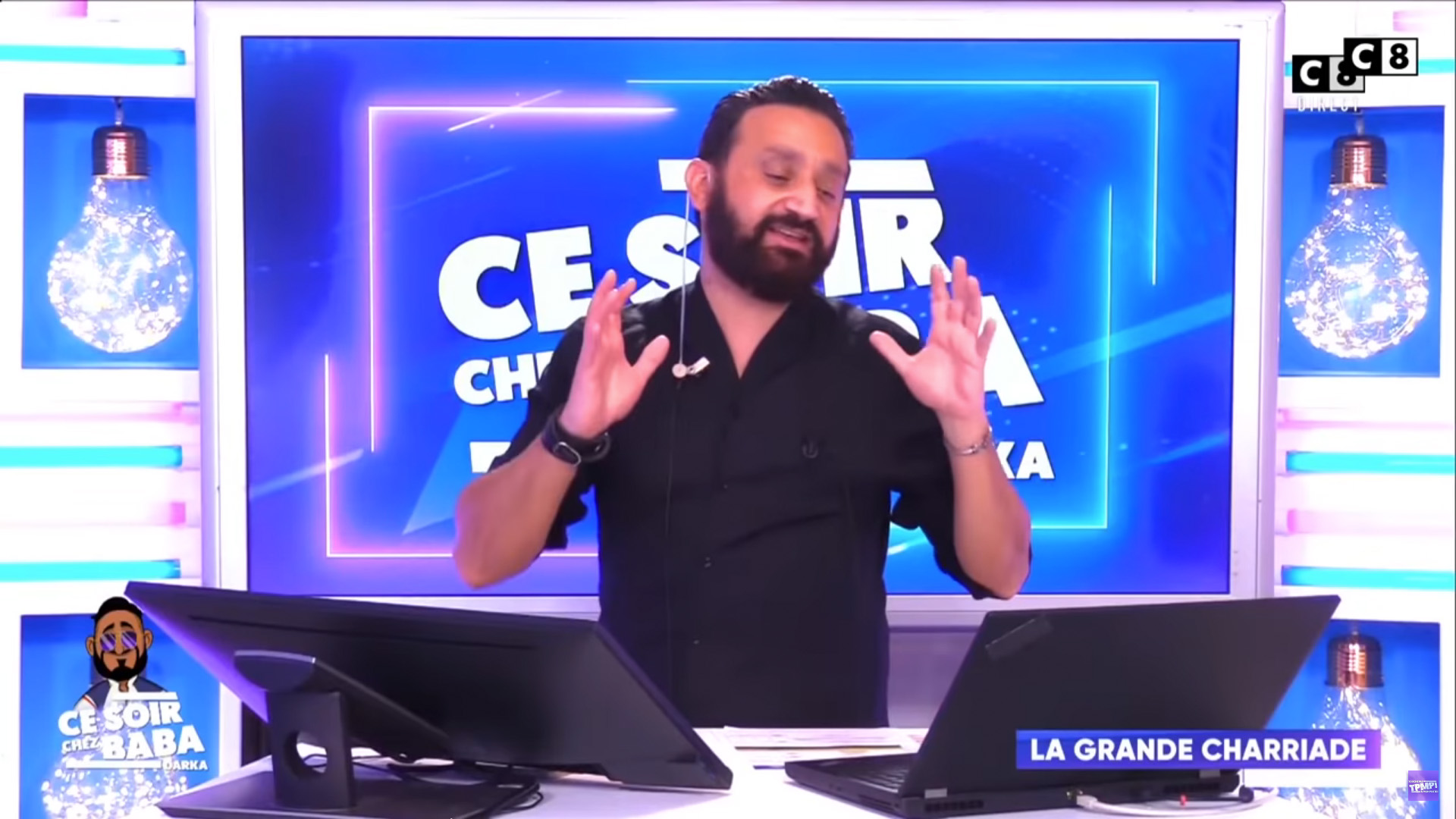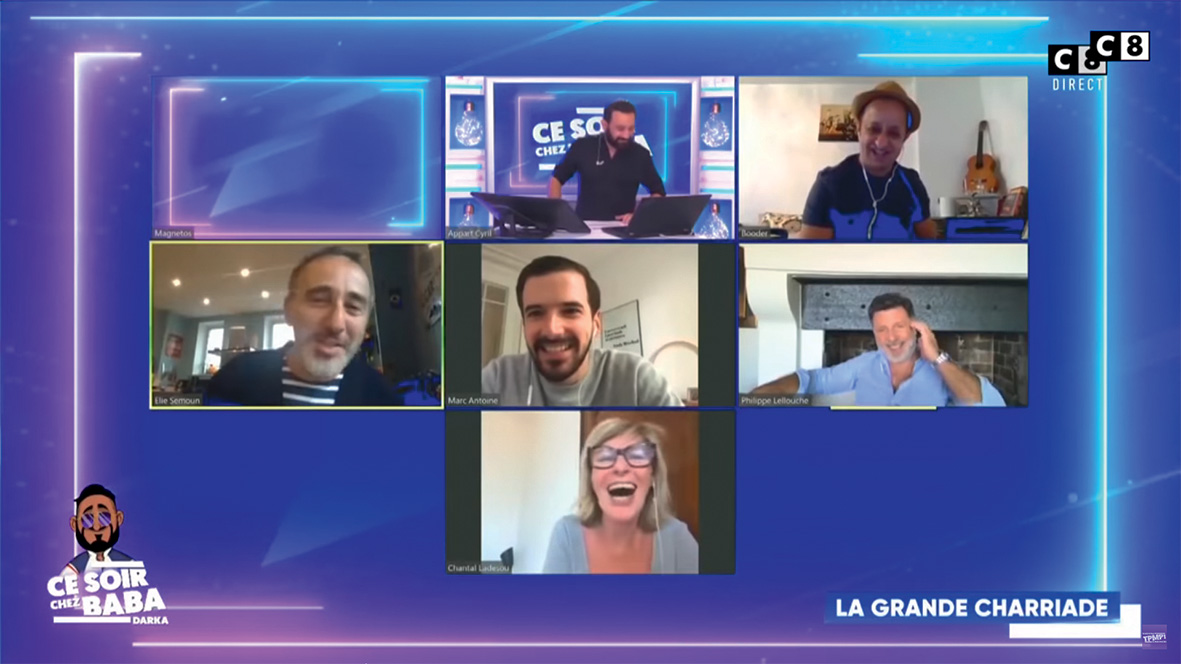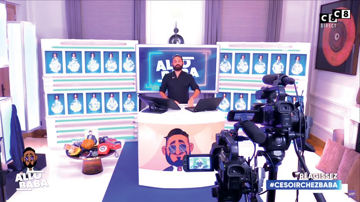 Sur C8, l’émission quotidienne de Cyril Hanouna s’est transportée chez lui et a été renommée Chez Baba, avec des chroniqueurs intervenant à distance via Zoom. La configuration du décor a évolué au cours du confinement. Au départ constitué d’un simple canapé, il s’est élargi à un mini-plateau avec un pupitre et un couple d’écrans sur lesquels l’animateur gérait les interventions de ses chroniqueurs via Zoom depuis un ordinateur à sa disposition.