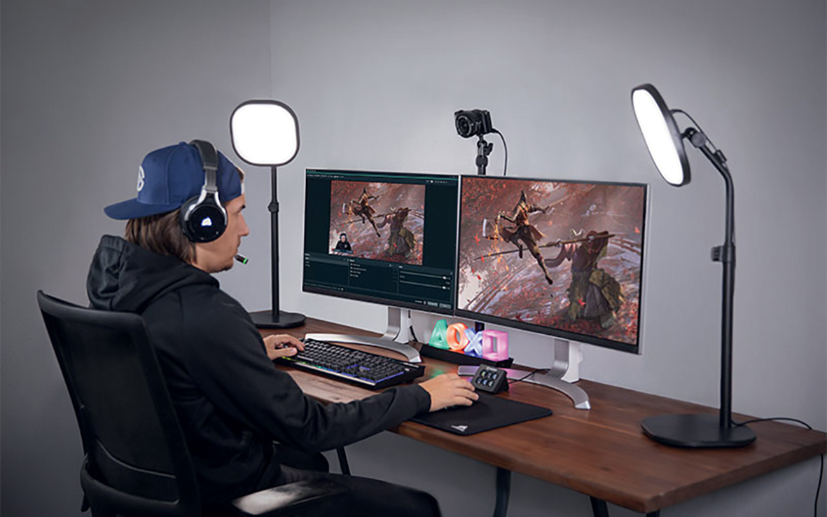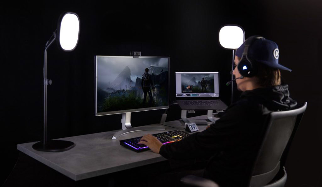 L’éclairage est aussi un élément essentiel pour donner un rendu agréable à l’image. La luminosité normale d’une pièce en journée donne de bons résultats à condition de se placer correctement par rapport à la ou les fenêtres. Ne jamais se placer dos à une fenêtre ou face à un mur violemment éclairé. Dans certaines situations d’éclairage un peu compliquées, et surtout si les interventions vers un plateau TV deviennent récurrentes, il peut être souhaitable de prévoir un complément de lumière avec des petits projecteurs Led comme le kit Key Light Air d’Elgato.