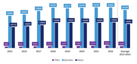 La production de fictions TV originales a repris sa croissance après le creux provoqué par la crise du Covid. En 2022, le nombre de fictions produites a augmenté de 12 % à 1 541 titres, alors que le nombre d’épisodes a stagné (24 685) tout comme le volume d’heures produites (15 593).
