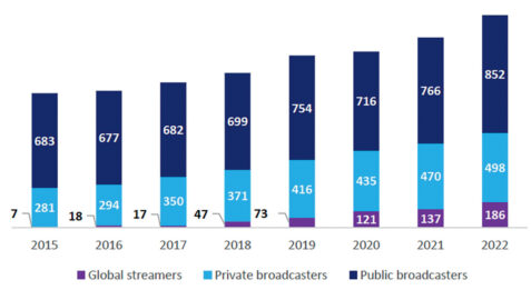 En 2015, les streamers étaient quasiment invisibles sur le marché européen de la production de fictions, avec seulement 7 programmes identifiés par l’Observatoire européen de l’audiovisuel. Progressivement, ils ont augmenté leur présence mais ce n’est qu’à partir de 2020 qu’ils ont franchi le cap des 100 productions. En 2022, avec 186 programmes produits, les streamers représentent 12 % des titres et 3 % des heures produites car à la différence des diffuseurs publics et des diffuseurs privés, ils ne produisent pas de feuilletons et de télénovelas, ce qui limite leur poids final.