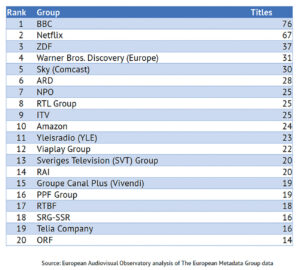 La montée en puissance des streamers se mesure à travers le classement des producteurs de séries de 13 épisodes ou moins sur l’année 2022. Cependant c’est la BBC qui arrive en tête des productions avec 76 programmes. Mais la vraie surprise provient de Netflix qui se classe en deuxième position avec 67 fictions produites ; si on ajoute celles produites par Amazon, on arrive à 91 séries produites en 2022 par deux plates-formes seulement.