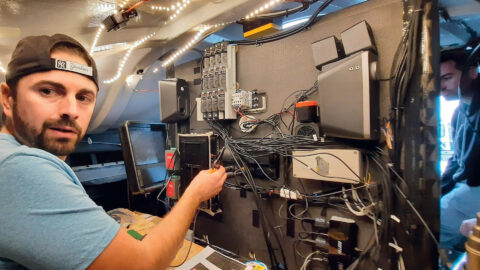 Lors d’une course au large, un navigateur doit se concentrer sur sa navigation. Il fallait donc que les manipulations des caméras soient simplifiées au maximum. Il fallait aussi économiser l’énergie qui est précieuse à bord. En effet, la seule source est un petit moteur diesel qui sert à alimenter l’équipement électronique. Donc, les images des caméras sont d’abord enregistrées sur les cartes internes (micro SD de 512 Go). Environ tous les quatre jours, le skipper Thomas Ruyant reliait un disque dur sur son ordinateur dédié et cela déclenchait la sauvegarde des images des cartes des caméras (exactement le même système que sur un tournage « normal », les sauvegardes des rushes étaient pilotées par le logiciel de l’ordinateur). Cela était possible grâce aux câbles de 200 m au total environ, minutieusement préparés, installés, protégés, soudés, qui reliaient chaque caméra (sauf deux), au boîtier de commande de Thomas. Ainsi, il pouvait tous les jours déclencher 3×3 mn d’enregistrement de toutes les caméras. Les deux caméras trop éloignées étaient dotées chacune d’une carte de 1 To (la plus grande capacité disponible dans ce format à l’époque) qui n’ont été déchargées qu’à l’arrivée.